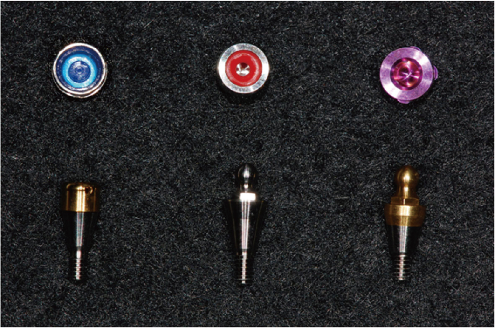 PURPOSE. The aim of this study was to compare the changes in retentive force of stud attachments for implant overdentures by in vitro 2-year?wear simulation. MATERIALS AND METHODS. Three commercially available attachment systems were investigated: Kerator blue, O-ring red, and EZ lock. Two implant fixtures were embedded in parallel in each custom base mounting. Five pairs of each attachment system were tested.
